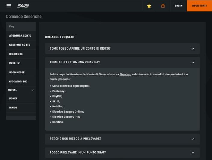 SNAI è la risposta per l'Italia ed i giocatori italiani. La piattaforma imponente incorpora ogni genere di gioco su di un unico sito web. Questo vantaggio elimina il fastidio di passare ad altri portali di gioco online. I termini e le condizioni lasciano alcune domande senza risposta e dotrebbero essere più accurate.