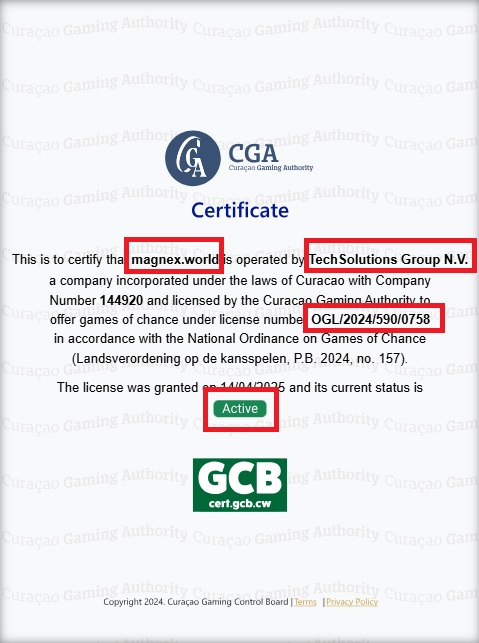 Il documento pubblicato sul sito web magnex.world elenca TechSolutions Group NV (numero di registrazione della società 144920) come titolare della licenza e fa riferimento al numero di licenza OGL/2024/590/0758, affermando che la licenza è stata rilasciata il 14.04.2025 e che il suo stato attuale è ATTIVO.