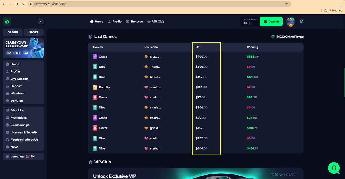 Prova n. 7: Scommesse e vincite visualizzate in modo non realistico sul loro sito webLa piattaforma del casinò mostra un elenco delle scommesse e delle vincite recenti attribuite ai presunti giocatori. Gli importi mostrati includono valori di scommessa insolitamente elevati e frequenti vincite elevate, che sembrano incoerenti con il comportamento realistico dei giocatori e con gli schemi di gioco standard.