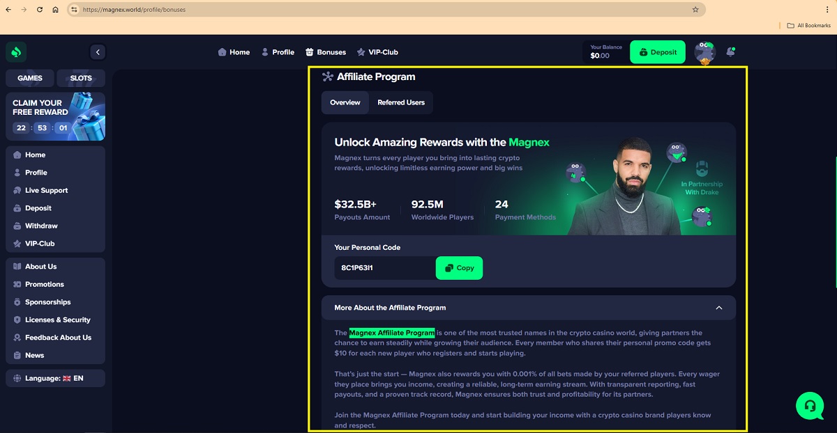🚨 Valutazione del programma di affiliazione del casinòSulla base delle informazioni pubbliche disponibili, non vi è alcuna prova verificabile che esista attualmente un programma di affiliazione legittimo per iGaming o casinò con criptovalute gestito sotto il nome di "Programma di affiliazione Magnex". Le affermazioni che descrivono un Programma di affiliazione Magnex, tra cui pagamenti garantiti di 10 $ per giocatore registrato, guadagni costanti dello 0,001% su tutte le scommesse e riferimenti a contabilità trasparente e pagamenti rapidi, non possono essere comprovate da fonti affidabili o riconosciute dal settore.