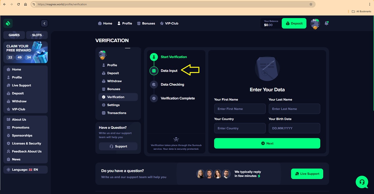 Al giocatore viene chiesto di inserire i dati personali di base, tra cui nome completo, paese di residenza e data di nascita.Fase 3: Controllo dei dati