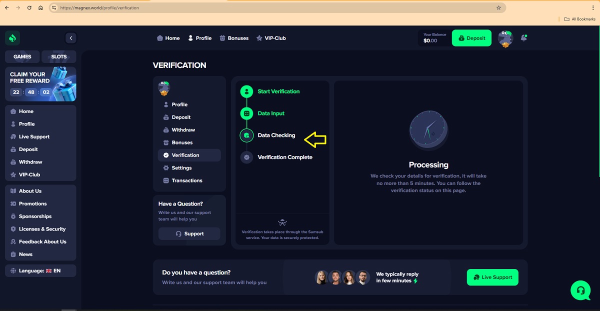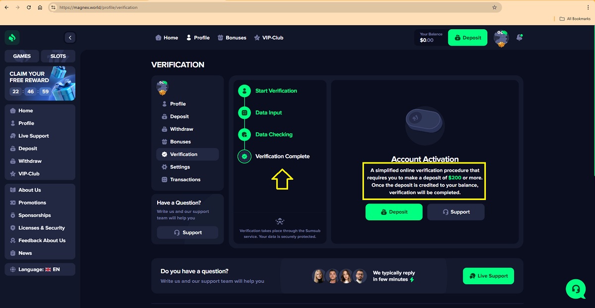 La presunta procedura di verifica dell'account giocatore su magnex.world rappresenta un modello di truffa comunemente utilizzato dai "casinò" fraudolenti per ingannare i giocatori. Accedendo al proprio profilo nella scheda "Verifica", ai giocatori viene presentata una procedura in quattro fasi presentata come una legittima procedura di verifica dell'account.