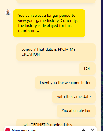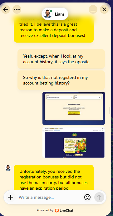 Gli ho mostrato la cronologia del mio casinò a partire dalla data di creazione, senza alcuna attività. Poi mi ha detto: "Non l'hai mai riscattato, quindi è scaduto".
