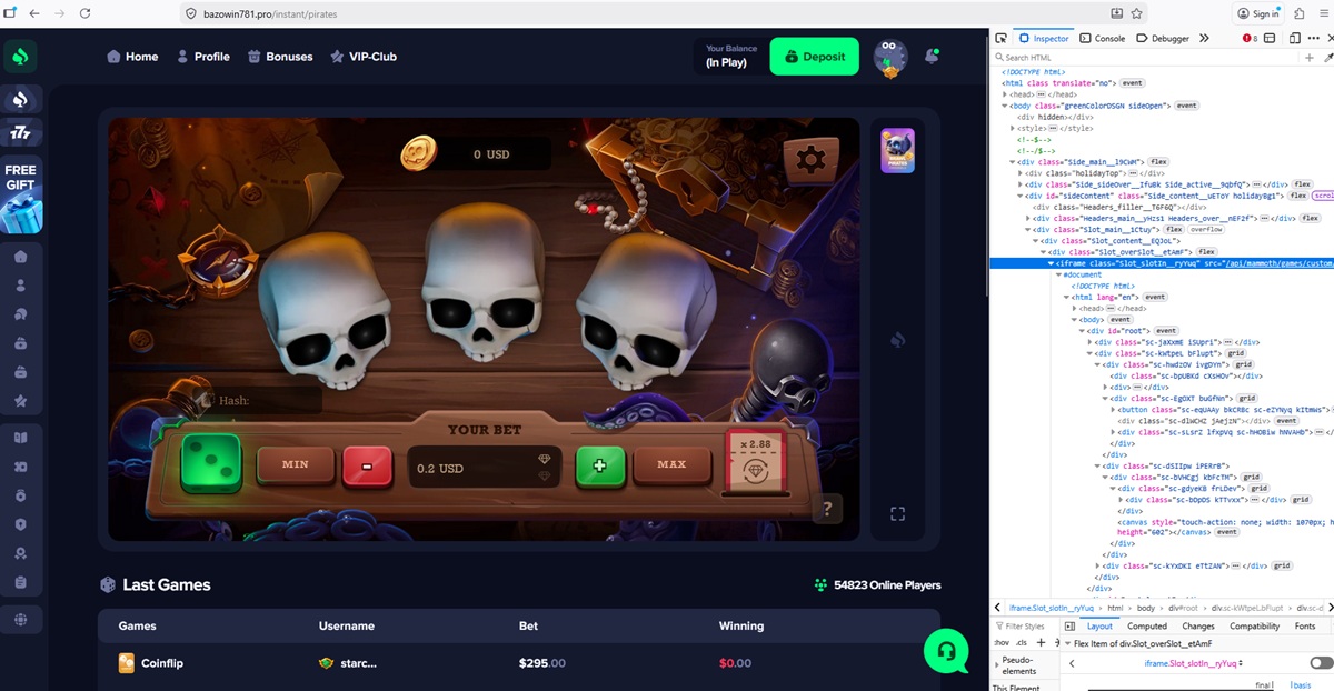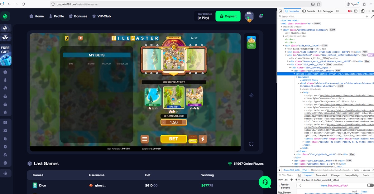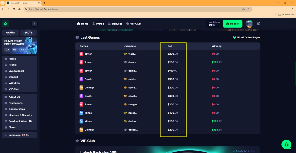 La piattaforma del casinò mostra un elenco di scommesse e vincite recenti attribuite a presunti giocatori. Gli importi mostrati includono puntate di valore insolitamente elevato e frequenti vincite ingenti, che sembrano incoerenti con il comportamento reale di un giocatore e con i modelli di gioco standard.