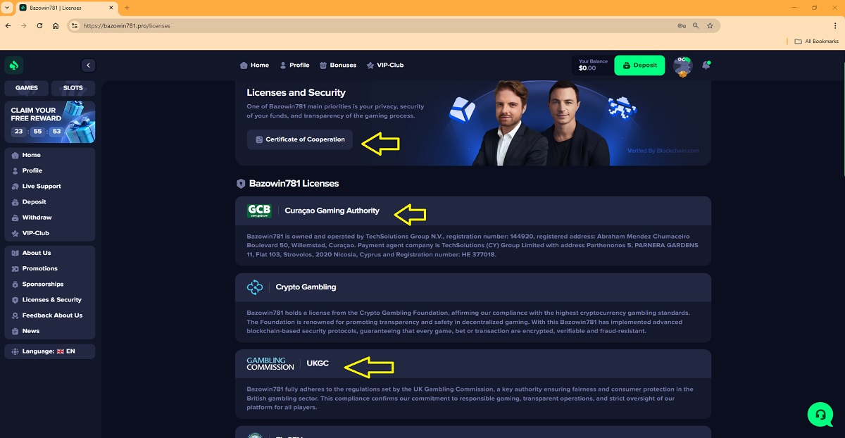 ➡️ Conclusion: The information presented across bazowin781.pro's website demonstrates clear misuse and misrepresentation of licensing details. Multiple entities are inconsistently identified as the operator, and license numbers are either revoked, expired, or attributed to companies that are not the actual operators.