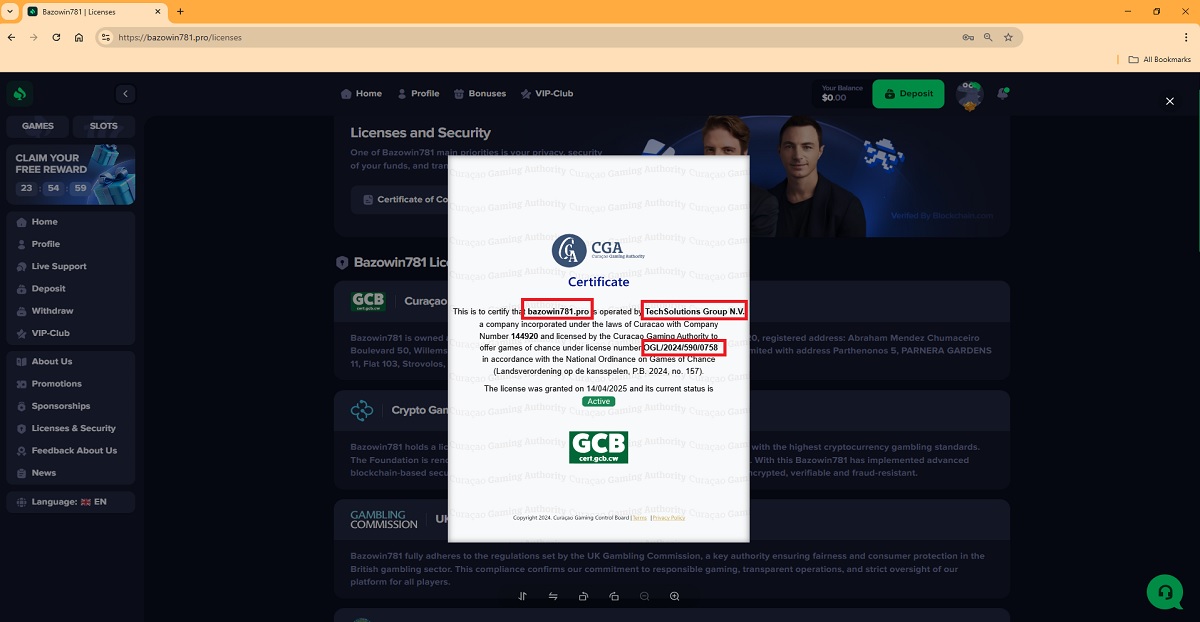 Il documento pubblicato su Il sito web bazowin781.pro elenca TechSolutions Group NV (numero di registrazione aziendale 144920) come titolare della licenza e fa riferimento al numero di licenza OGL/2024/590/0758, affermando che la licenza è stata rilasciata il 14.04.2025 e che il suo stato attuale è ATTIVO.