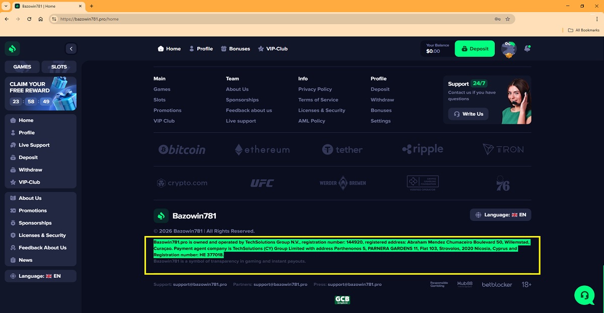 "bazowin781.pro is owned and operated by TechSolutions Group N.V., registration number: 144920, registered address: Abraham Mendez Chumaceiro Boulevard 50, Willemstad, Curaçao. Payment agent company is TechSolutions (CY) Group Limited with address Parthenonos 5, PARNERA GARDENS 11, Flat 103, Strovolos, 2020 Nicosia, Cyprus, and Registration number: HE 377018."