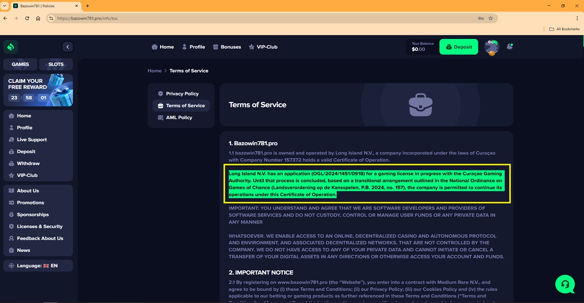 The website lists two different license numbers and two different owners: TechSolutions Group N.V., referenced in the website footer and on the License and Security page (license number: OGL/2024/590/0758), and Long Island N.V., named in the casino’s Terms and Conditions (license number: OGL/2024/1451/0918).