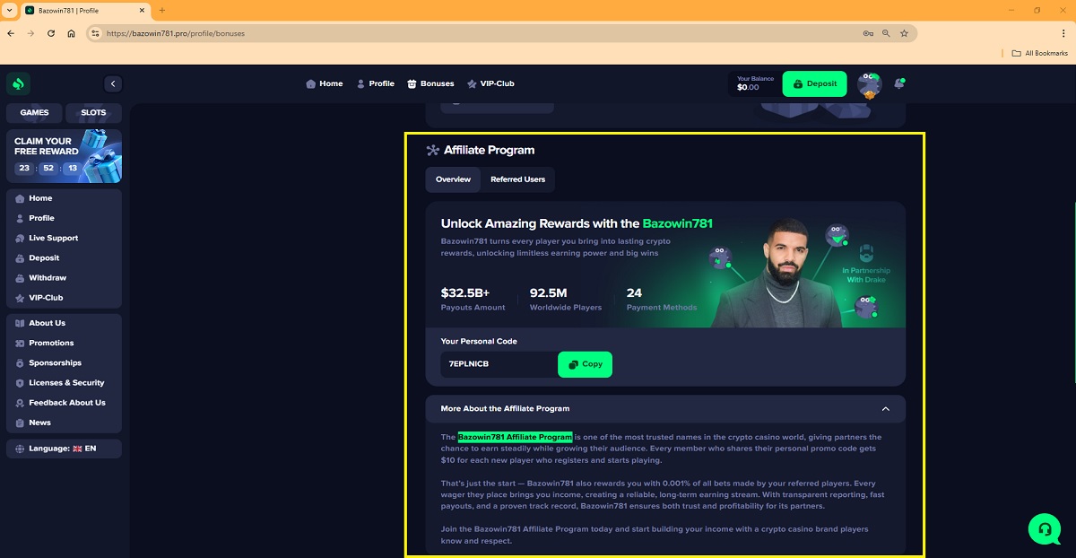 Based on the available public information, there is no verifiable evidence that a legitimate iGaming or crypto casino affiliate program operated under the name “Bazowin781 Affiliate Program” currently exists. The claims describing a Bazowin781 Affiliate Program — including guaranteed payments of $10 per registered player, ongoing earnings of 0.001% of all bets, and references to transparent accounting and fast payouts — cannot be substantiated through reliable or industry-recognized sources.