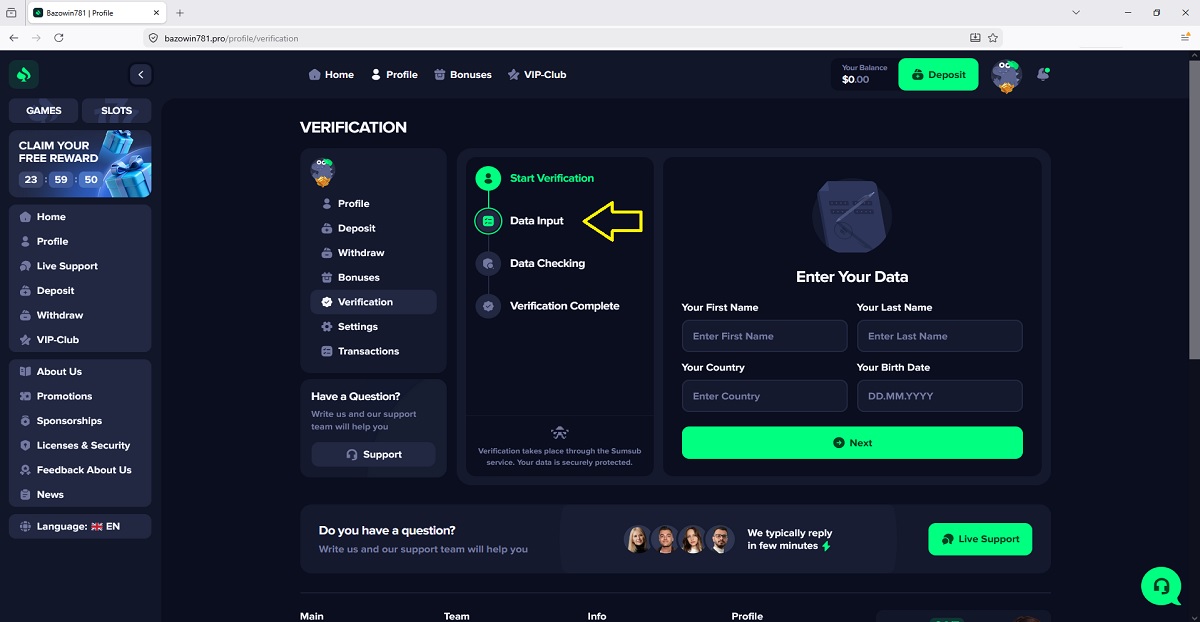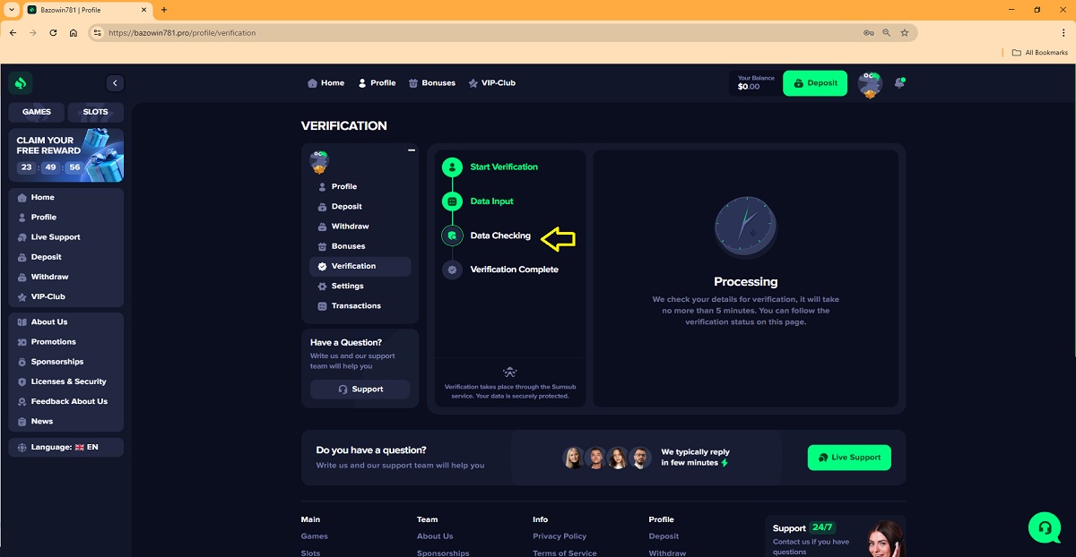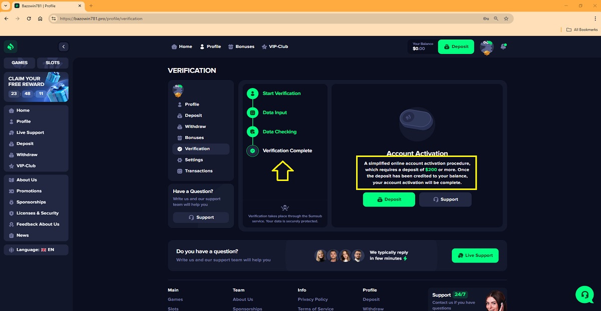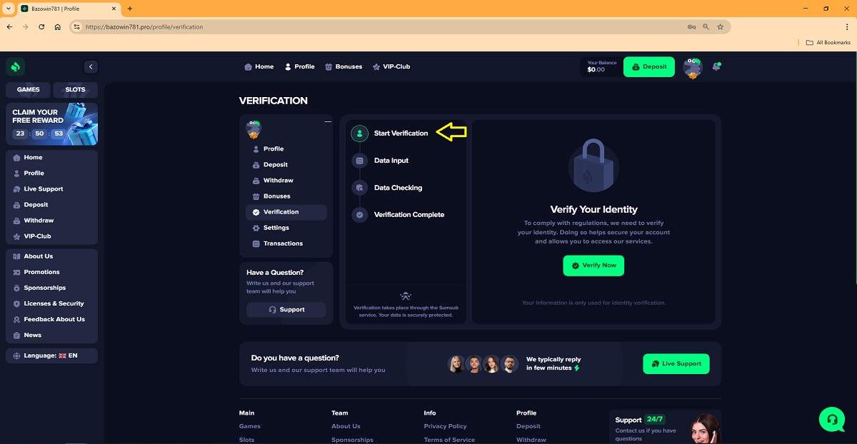 Il presunto processo di verifica dell'account giocatore su bazowin781.pro rappresenta uno schema di truffa comunemente utilizzato dai "casinò" fraudolenti per ingannare i giocatori. Accedendo al proprio profilo nella sezione "Verifica" , ai giocatori viene presentato un processo in quattro fasi che viene spacciato per una legittima procedura di verifica dell'account.