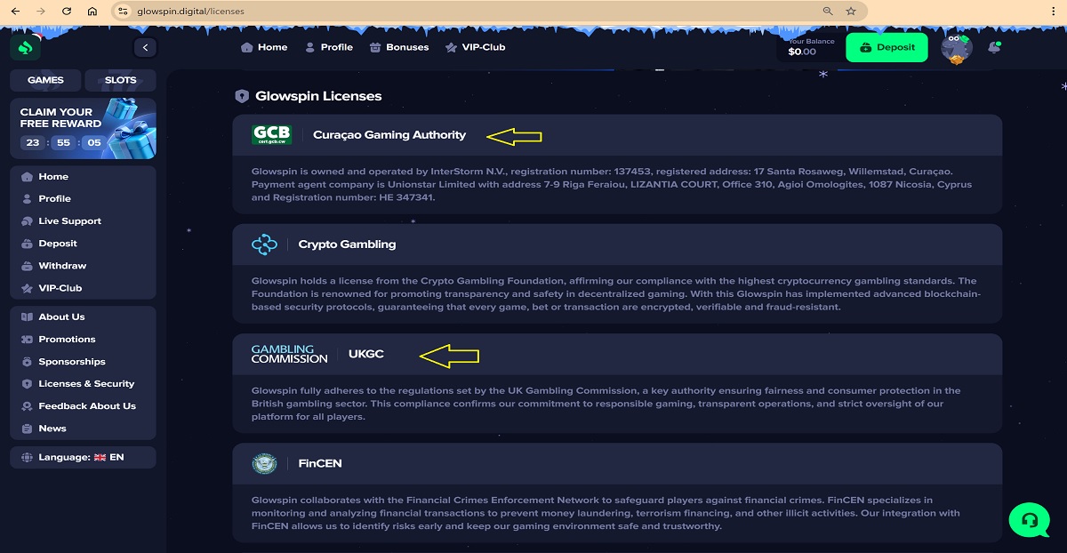 Despite their claims, Glowspin.digital Casino does not hold a UK Gambling Commission license. The information provided on their website is misleading, as they are not authorized or regulated by the UK Gambling Commission.