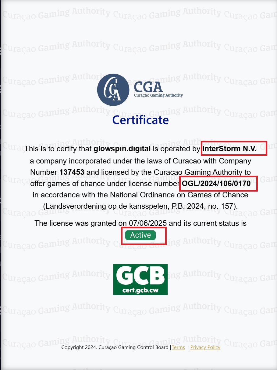 Il documento pubblicato sul sito web glowspin.digital indica InterStorm (Curaçao) NV (numero di registrazione della società 137453) come titolare della licenza e fa riferimento al numero di licenza OGL/2024/106/0170, affermando che la licenza è stata rilasciata il 07.06.2025 e che il suo stato attuale è ATTIVO. Tuttavia, queste informazioni non sono coerenti con lo stato della licenza visualizzato sul sito web ufficiale della Curaçao Gaming Authority (GCA).