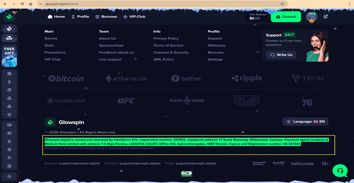 "Glowspin.digital is owned and operated by InterStorm N.V., registration number: 137453, registered address: 17 Santa Rosaweg, Willemstad, Curaçao. Payment agent company is Medium Rare Limited with address 7-9 Riga Feraiou, LIZANTIA COURT, Office 310, Agioi Omologites, 1087 Nicosia, Cyprus and Registration number: HE 347341. "