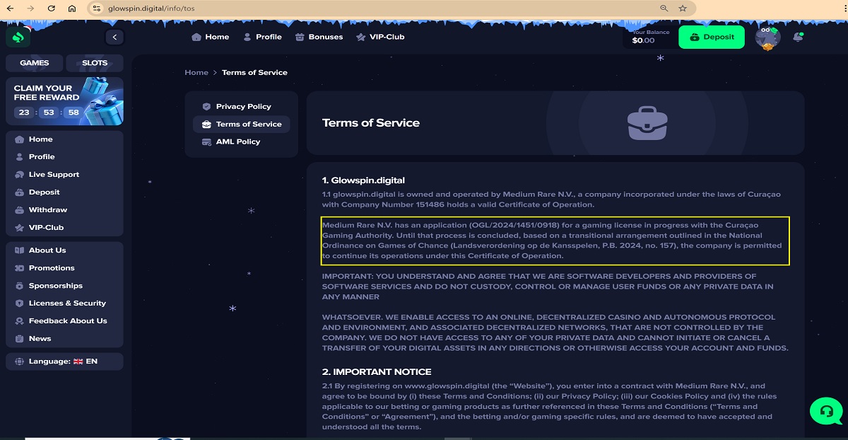 "Glowspin.digital è di proprietà e gestito da InterStorm NV, numero di registrazione: 137453, indirizzo registrato: 17 Santa Rosaweg, Willemstad, Curaçao. La società agente di pagamento è Medium Rare Limited con indirizzo 7-9 Riga Feraiou, LIZANTIA COURT, Office 310, Agioi Omologites, 1087 Nicosia, Cipro e numero di registrazione: HE 347341."