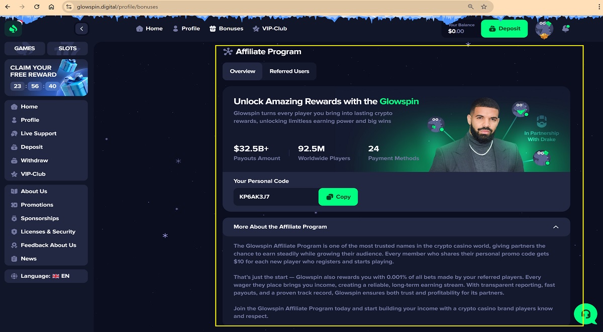 Based on the available public information, there is no verifiable evidence that a legitimate iGaming or crypto casino affiliate program operated under the name “Glowspin Affiliate Program” currently exists. The claims describing a Glowspin Affiliate Program — including guaranteed payments of $10 per registered player, ongoing earnings of 0.001% of all bets, and references to transparent accounting and fast payouts — cannot be substantiated through reliable or industry-recognized sources.