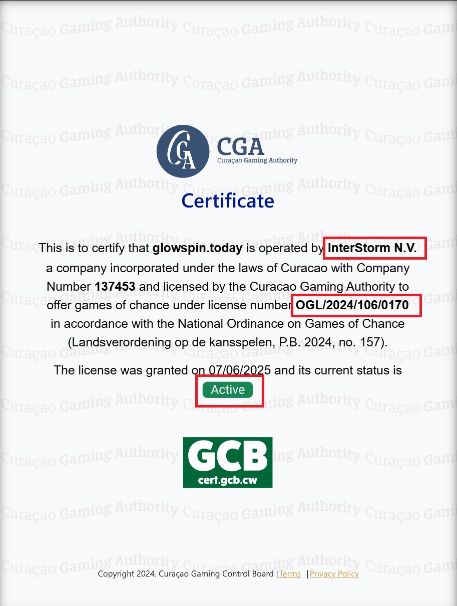 Il documento pubblicato sul sito web glowspin.today indica InterStorm (Curaçao) NV (numero di registrazione della società 137453) come titolare della licenza e fa riferimento al numero di licenza OGL/2024/106/0170, affermando che la licenza è stata rilasciata il 07.06.2025 e che il suo stato attuale è ATTIVO. Tuttavia, queste informazioni non sono coerenti con lo stato della licenza visualizzato sul sito web ufficiale della Curaçao Gaming Authority (GCA).