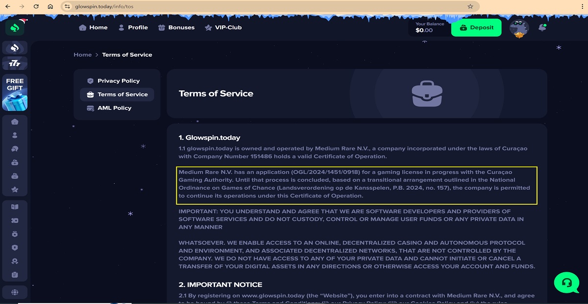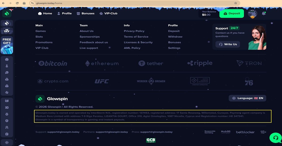 "Glowspin.today è di proprietà e gestito da InterStorm NV, numero di registrazione: 137453, indirizzo registrato: 17 Santa Rosaweg, Willemstad, Curaçao. La società agente di pagamento è Medium Rare Limited con indirizzo 7-9 Riga Feraiou, LIZANTIA COURT, Office 310, Agioi Omologites, 1087 Nicosia, Cipro e numero di registrazione: HE 347341."
