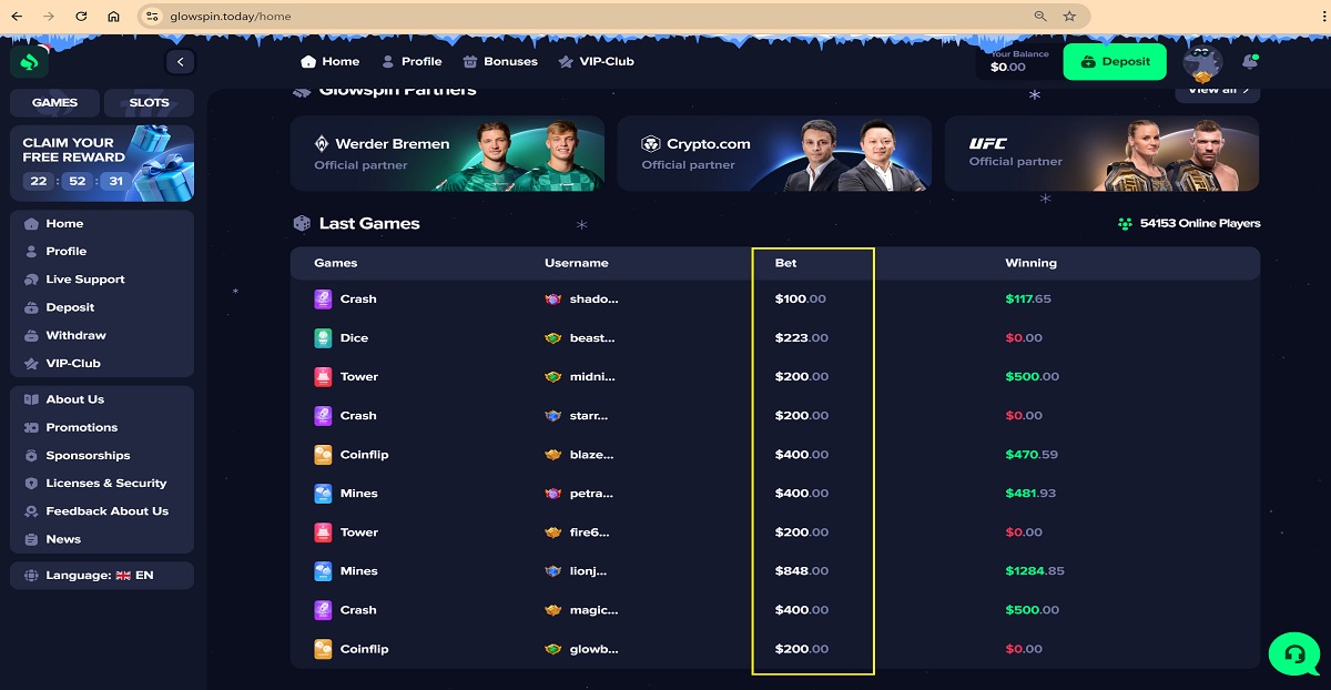 Glowspin.today operates without a valid gambling license, features fake game providers, and misleads players with false regulatory claims. Depositing money on this platform carries a high financial risk. Players are strongly advised to avoid this casino.