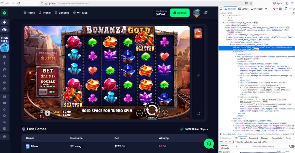 La piattaforma del casinò mostra un elenco delle scommesse e delle vincite recenti attribuite ai presunti giocatori. Gli importi mostrati includono valori di scommessa insolitamente elevati e frequenti vincite elevate, che sembrano incoerenti con il comportamento realistico dei giocatori e con gli schemi di gioco standard.