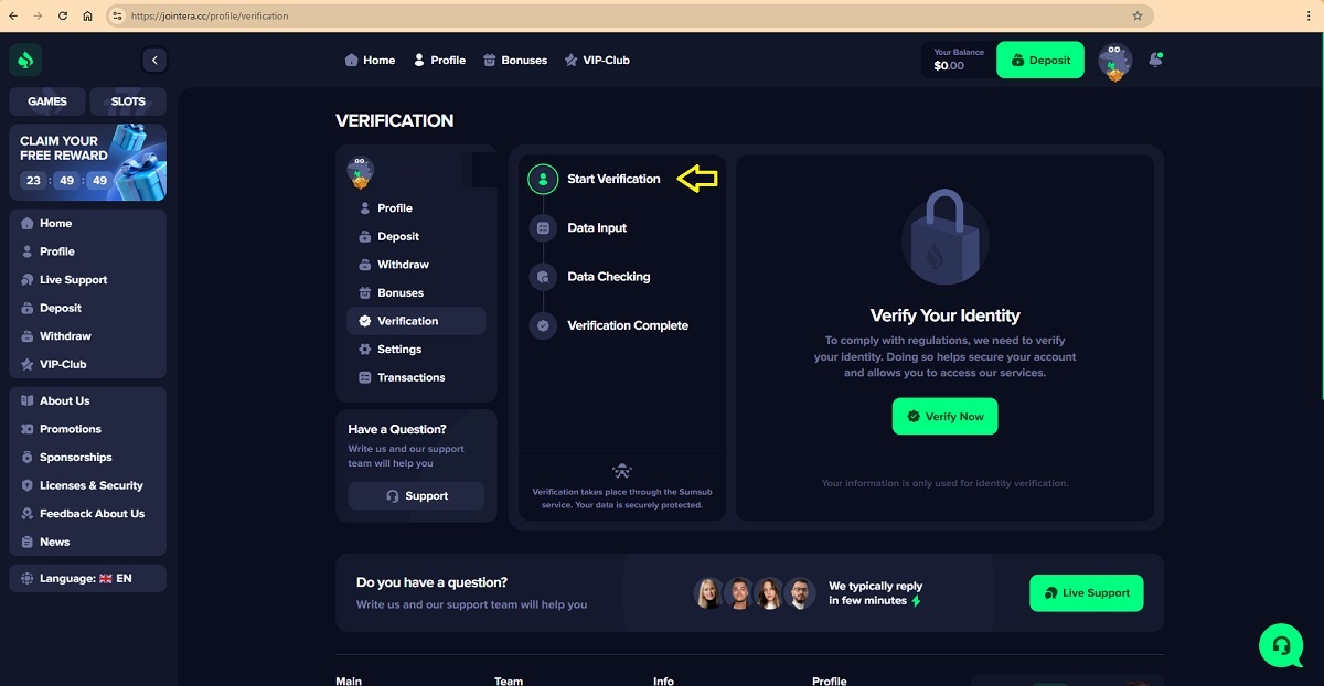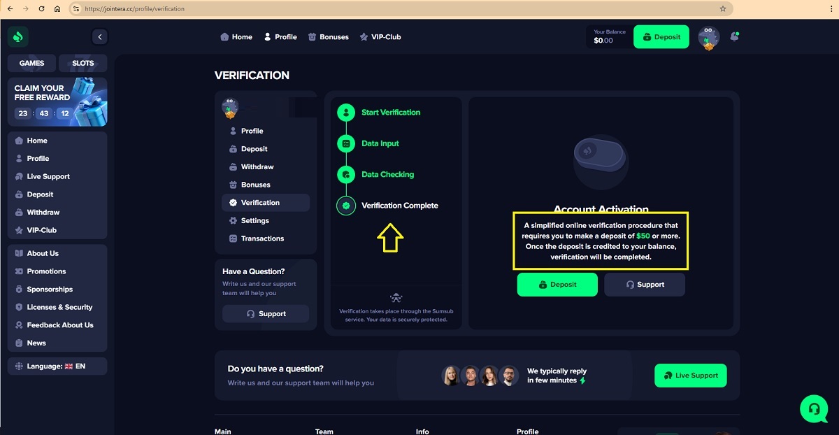 The alleged player account verification process on jointera.cc represents a key scam pattern commonly used by fraudulent “casinos” to deceive players. When accessing their profile under the Verification tab, players are presented with a four-step process that is portrayed as a legitimate account verification procedure.