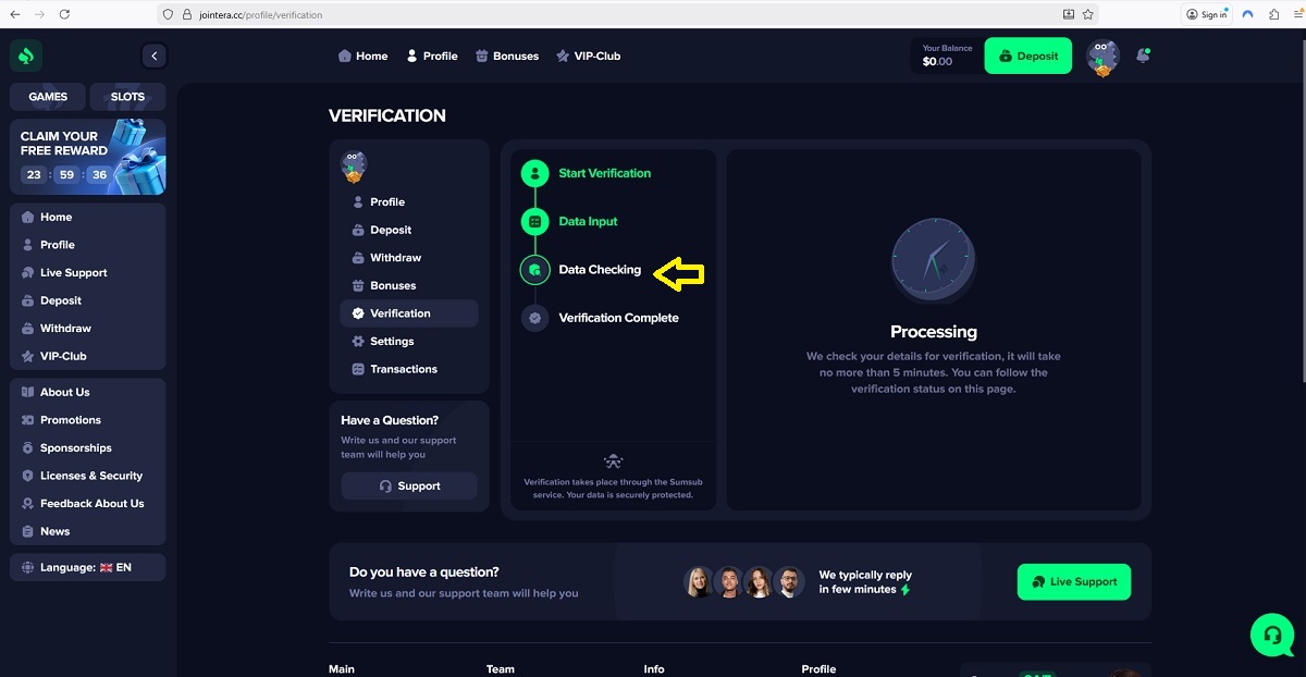 La presunta procedura di verifica dell'account giocatore su jointera.cc rappresenta un modello di truffa comunemente utilizzato dai "casinò" fraudolenti per ingannare i giocatori. Quando accedono al loro profilo nella scheda "Verifica" , ai giocatori viene presentata una procedura in quattro fasi che viene presentata come una legittima procedura di verifica dell'account.