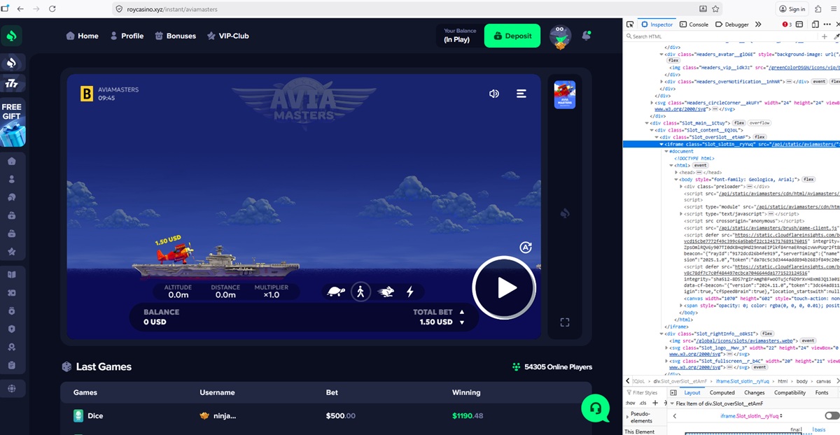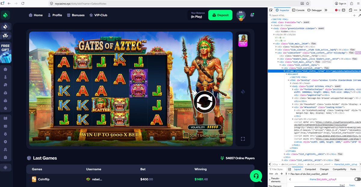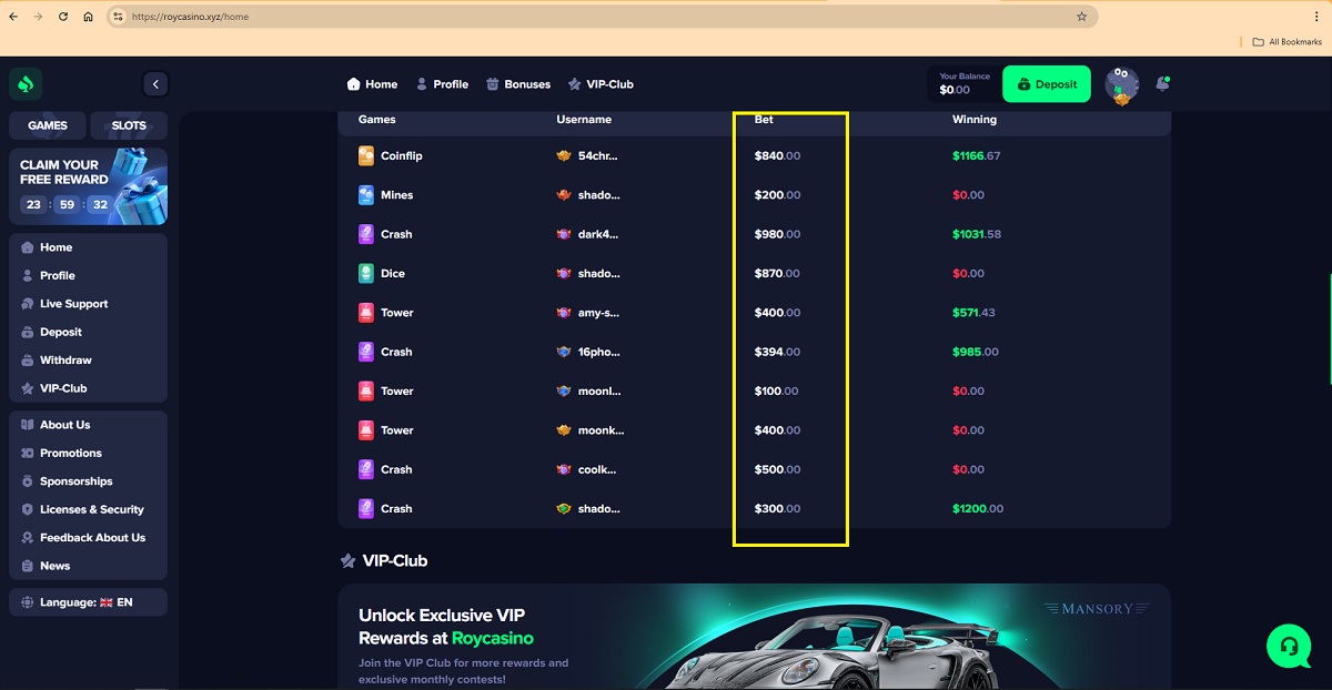 La piattaforma del casinò mostra un elenco di scommesse e vincite recenti attribuite a presunti giocatori. Gli importi mostrati includono puntate di valore insolitamente elevato e frequenti vincite ingenti, che sembrano incoerenti con il comportamento reale di un giocatore e con i modelli di gioco standard.