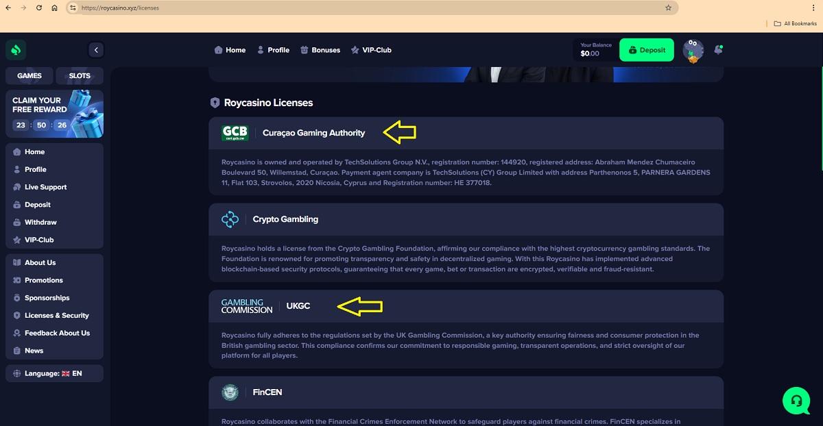 ➡️ Conclusione: Le informazioni presentate sul sito web roycasino.xyz dimostrano un chiaro uso improprio e una falsa rappresentazione dei dettagli relativi alle licenze. Diverse entità vengono identificate in modo incoerente come gestori e i numeri di licenza risultano revocati, scaduti o attribuiti a società che non sono i veri gestori.