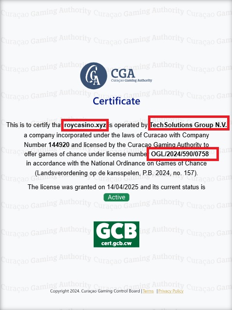 Il documento pubblicato su Il sito web roycasino.xyz elenca TechSolutions Group NV (numero di registrazione aziendale 144920) come titolare della licenza e fa riferimento al numero di licenza OGL/2024/590/0758, affermando che la licenza è stata rilasciata il 14.04.2025 e che il suo stato attuale è ATTIVO.