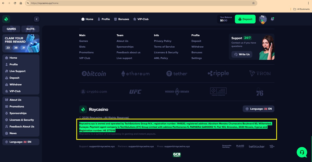 " roycasino.xyz is owned and operated by TechSolutions Group N.V., registration number: 144920, registered address: Abraham Mendez Chumaceiro Boulevard 50, Willemstad, Curaçao. Payment agent company is TechSolutions (CY) Group Limited with address Parthenonos 5, PARNERA GARDENS 11, Flat 103, Strovolos, 2020 Nicosia, Cyprus, and Registration number: HE 377018."