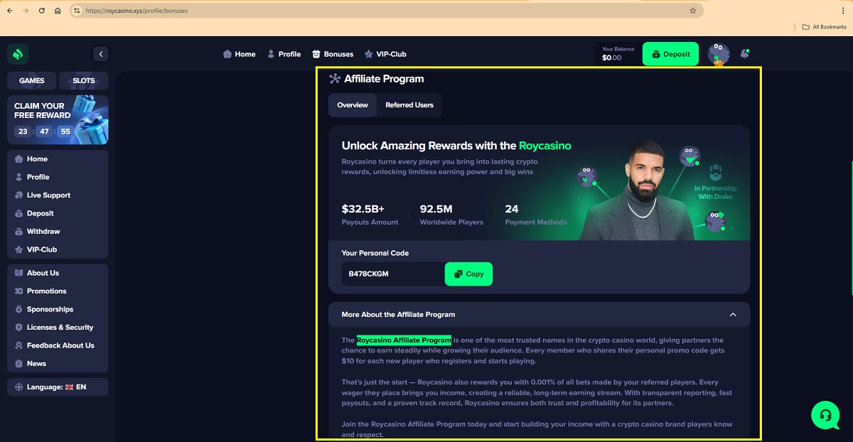 Based on the available public information, there is no verifiable evidence that a legitimate iGaming or crypto casino affiliate program operated under the name “Roycasino Affiliate Program” currently exists. The claims describing a Roycasino Affiliate Program — including guaranteed payments of $10 per registered player, ongoing earnings of 0.001% of all bets, and references to transparent accounting and fast payouts — cannot be substantiated through reliable or industry-recognized sources.