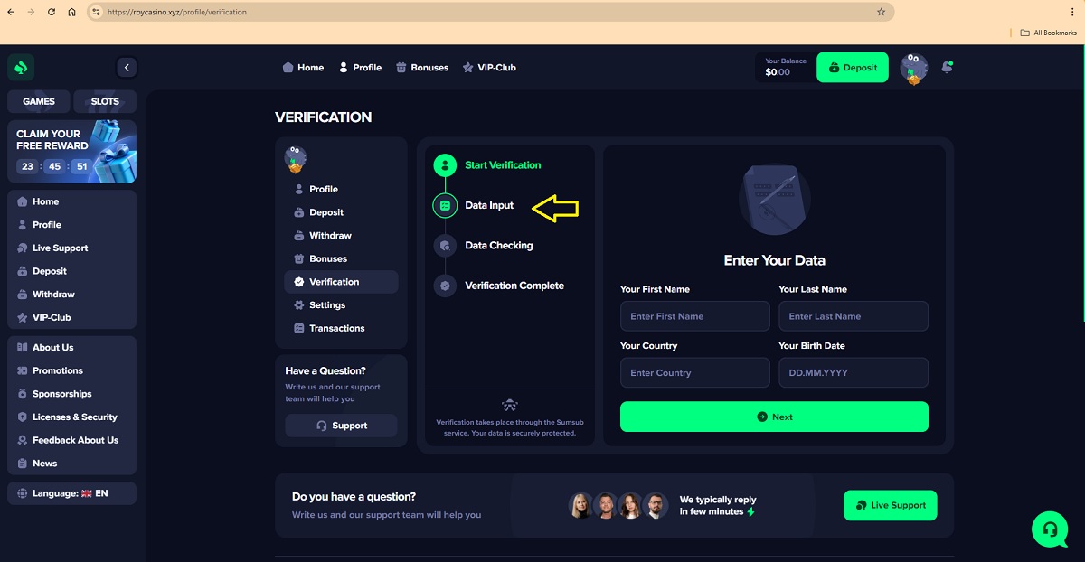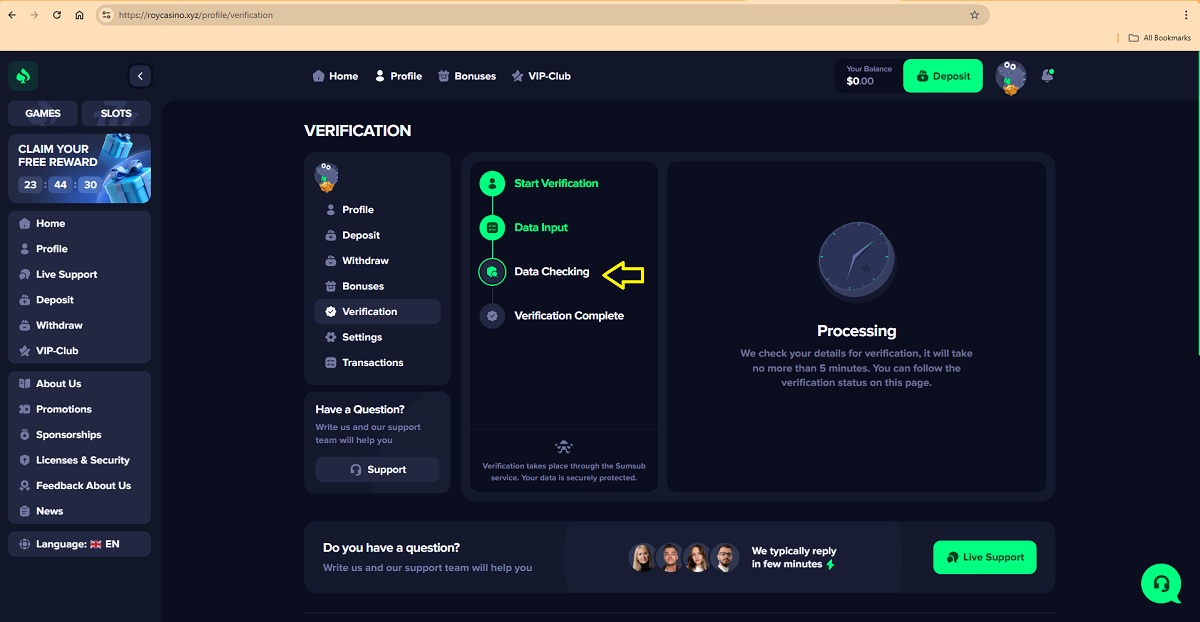 Il presunto processo di verifica dell'account giocatore su roycasino.xyz rappresenta uno schema di truffa comunemente utilizzato dai "casinò" fraudolenti per ingannare i giocatori. Accedendo al proprio profilo nella sezione "Verifica" , ai giocatori viene presentato un processo in quattro fasi che viene spacciato per una legittima procedura di verifica dell'account.