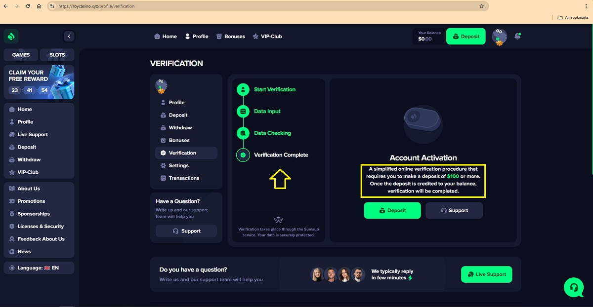 The alleged player account verification process on roycasino.xyz represents a key scam pattern commonly used by fraudulent “casinos” to deceive players. When accessing their profile under the Verification tab, players are presented with a four-step process that is portrayed as a legitimate account verification procedure.