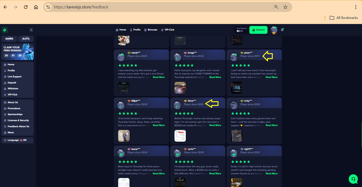 On the website’s Feedback page, only positive 5-star reviews are displayed. Some of these reviews claim to be from players who have been members since 2017, despite the fact that the tavexisjs.store domain was registered only recently, on 04 March 2026.