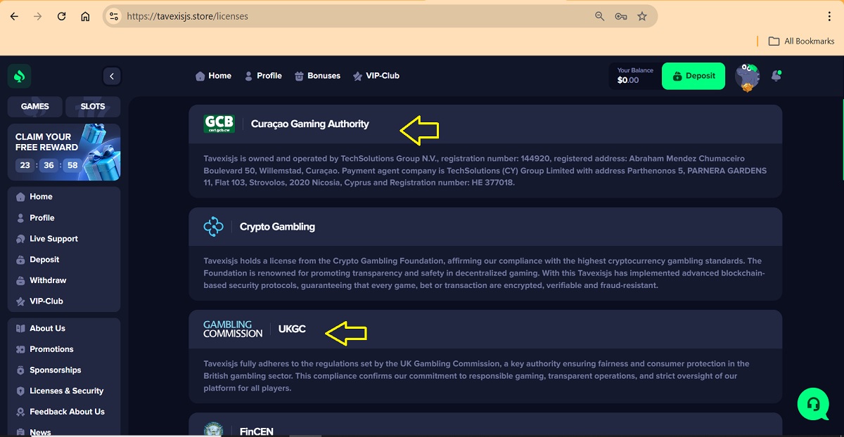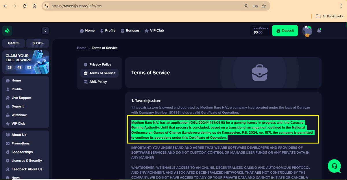 tavexisjs.store Opera senza una licenza di gioco valida, presenta falsi fornitori di giochi e inganna i giocatori con false dichiarazioni normative. Depositare denaro su questa piattaforma comporta un elevato rischio finanziario. Si consiglia vivamente ai giocatori di evitare questo casinò.