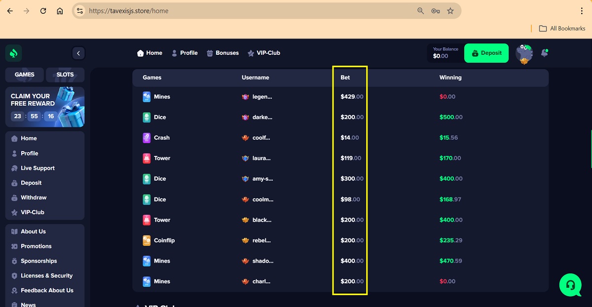 La piattaforma del casinò mostra un elenco delle scommesse e delle vincite recenti attribuite ai presunti giocatori. Gli importi mostrati includono valori di scommessa insolitamente elevati e frequenti vincite elevate, che sembrano incoerenti con il comportamento realistico dei giocatori e con gli schemi di gioco standard.
