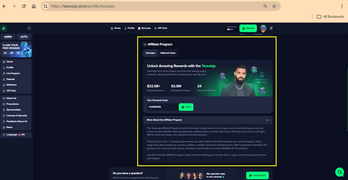 Based on the available public information, there is no verifiable evidence that a legitimate iGaming or crypto casino affiliate program operated under the name “Tavexisjs Affiliate Program” currently exists. The claims describing a Tavexisjs Affiliate Program — including guaranteed payments of $10 per registered player, ongoing earnings of 0.001% of all bets, and references to transparent accounting and fast payouts — cannot be substantiated through reliable or industry-recognized sources.