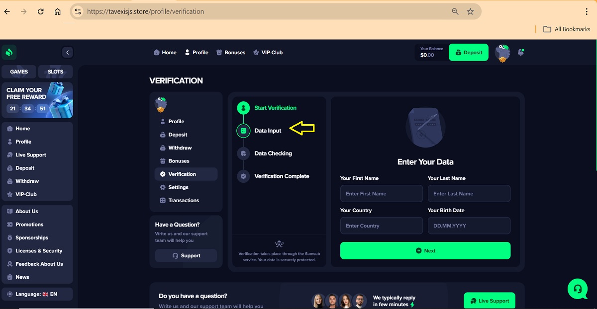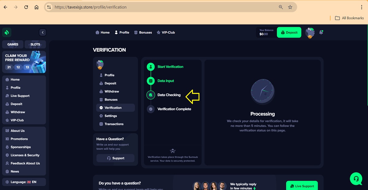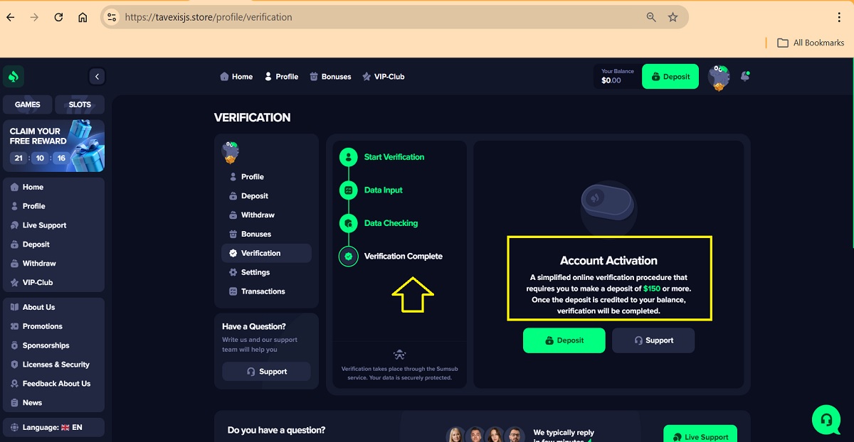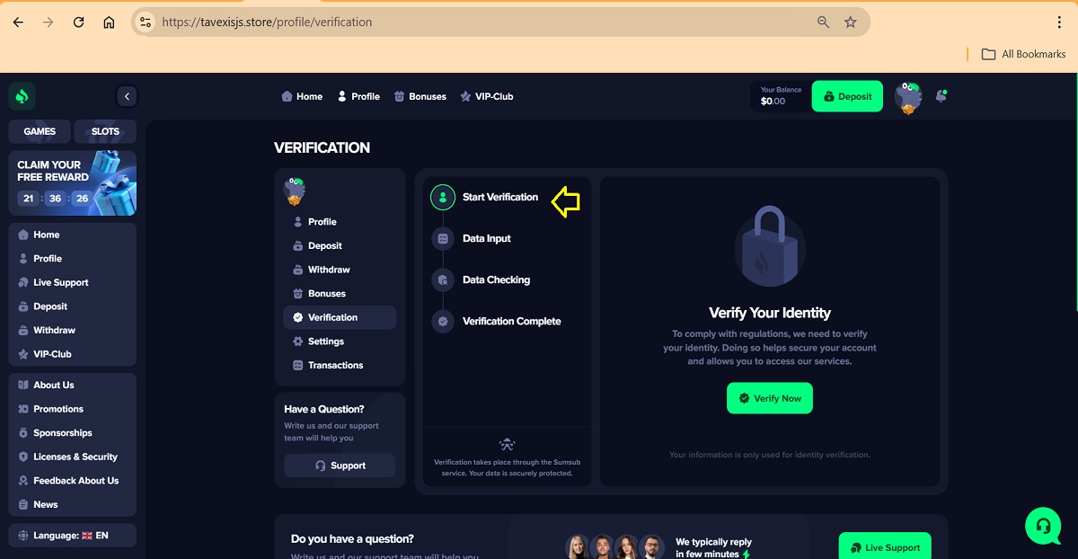 La presunta procedura di verifica dell'account giocatore su tavexisjs.store rappresenta un modello di truffa comunemente utilizzato dai "casinò" fraudolenti per ingannare i giocatori. Accedendo al proprio profilo nella scheda "Verifica", ai giocatori viene presentata una procedura in quattro fasi presentata come una legittima procedura di verifica dell'account.