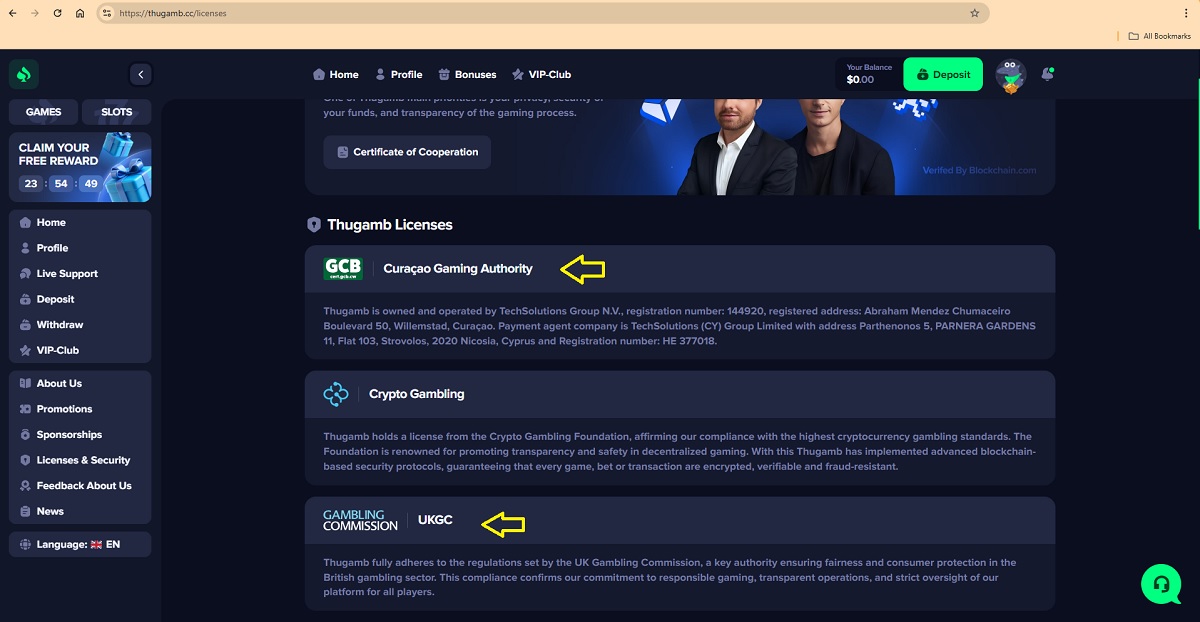 " Thugamb.cc è di proprietà e gestito da TechSolutions Group NV, numero di registrazione: 144920, sede legale: Abraham Mendez Chumaceiro Boulevard 50, Willemstad, Curaçao. La società agente di pagamento è TechSolutions (CY) Group Limited con sede in Parthenonos 5, PARNERA GARDENS 11, Flat 103, Strovolos, 2020 Nicosia, Cipro e numero di registrazione: HE 377018."