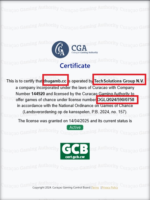 Il documento pubblicato su Il sito web Thugamb.cc elenca TechSolutions Group NV (numero di registrazione aziendale 144920) come titolare della licenza e fa riferimento al numero di licenza OGL/2024/590/0758, affermando che la licenza è stata rilasciata il 14.04.2025 e che il suo stato attuale è ATTIVO.