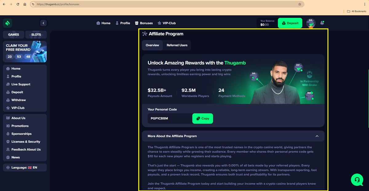 Based on the available public information, there is no verifiable evidence that a legitimate iGaming or crypto casino affiliate program operated under the name “Thugamb Affiliate Program” currently exists. The claims describing a Thugamb Affiliate Program — including guaranteed payments of $10 per registered player, ongoing earnings of 0.001% of all bets, and references to transparent accounting and fast payouts — cannot be substantiated through reliable or industry-recognized sources.