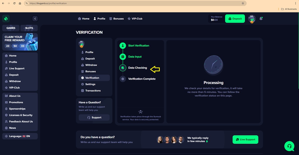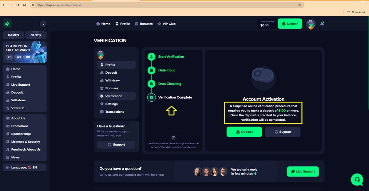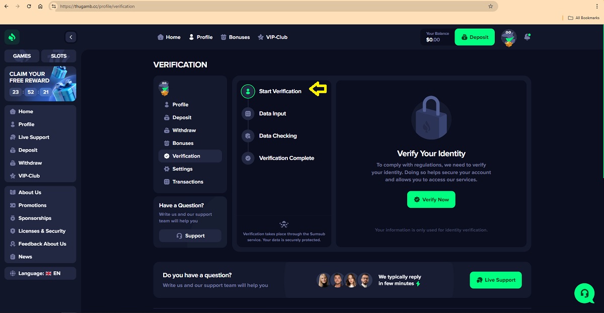 Il presunto processo di verifica dell'account giocatore su Thugamb.cc rappresenta uno schema di truffa comunemente utilizzato dai "casinò" fraudolenti per ingannare i giocatori. Accedendo al proprio profilo nella sezione "Verifica" , ai giocatori viene presentato un processo in quattro fasi che viene spacciato per una legittima procedura di verifica dell'account.