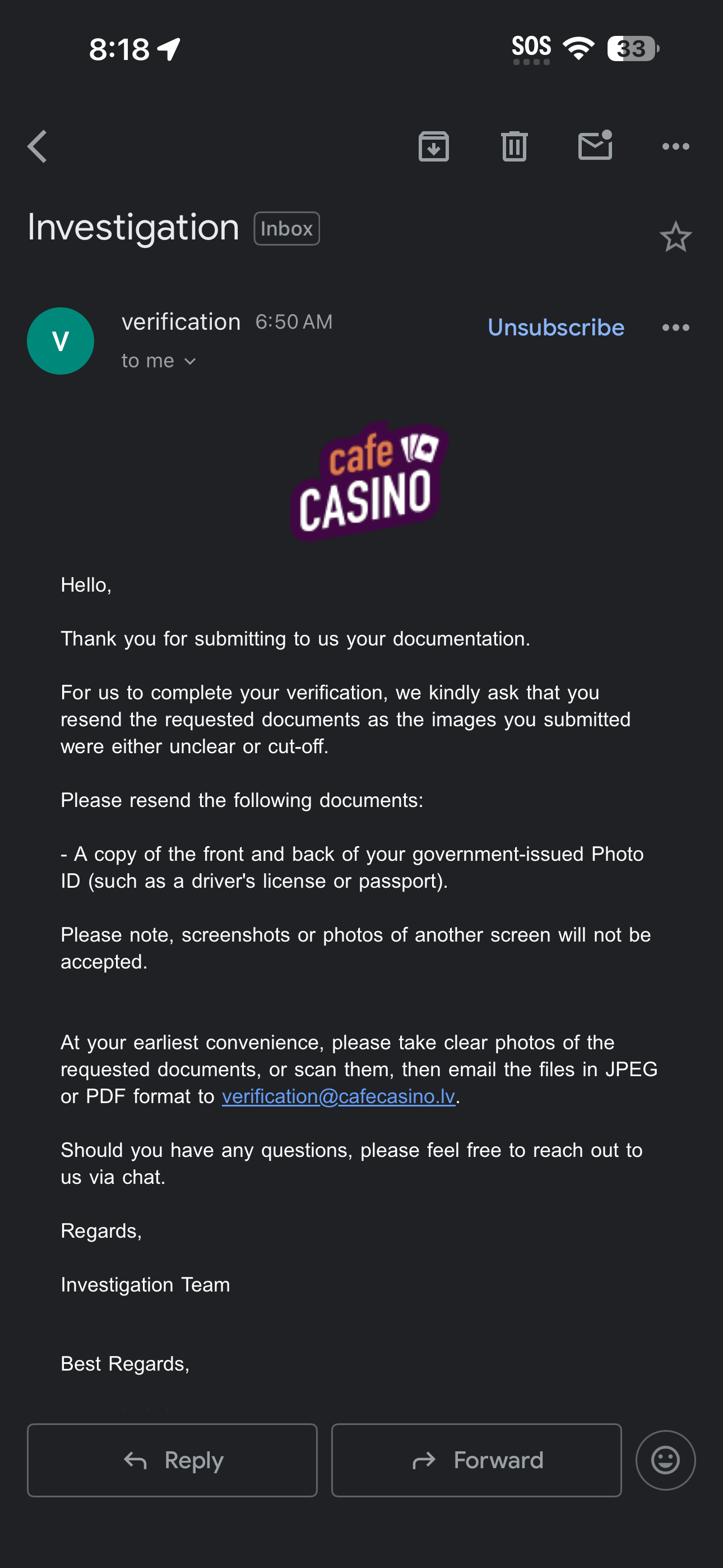 Mindy616 wrote:Jess, I need some help with verifying my account. I've been a player at cafe casino since 2022 and recently won a small amount of money. I went to update my phone number and when I didn't remember which business line I used, they immediately disabled my account. I have sent the documents required multiple times. I used to work in IT so I'm well aware of how to send a jpeg. However they continuously state I haven't sent them. I have asked in chat support to upload directly to them only to be denied. Please help.
