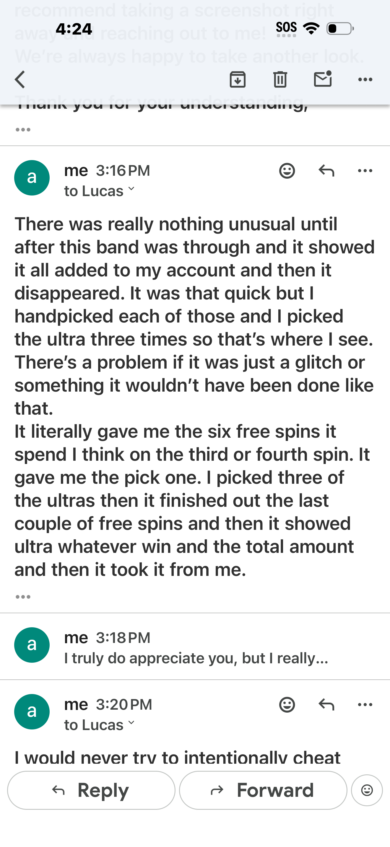 I won $20,000 SC on Chumba yesterday morning it was on a new game called pigs and pots. I got free bands then during the free bands I got the pick three and then handpicked and ended up with three ultras which was $20,000. It added it up then it finished with the free spins at the end it said ultra win then, it was taken directly right back out. I have attached my correspondence with them. I think this is ridiculous it will not let me send the rest of my replies. I will send them on the next reply, maybe