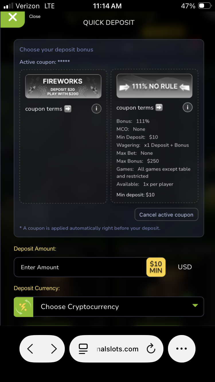 Se non avessi già utilizzato il tuo deposito, avremmo applicato immediatamente il coupon per te.Se sei disposto a darci una seconda possibilità, mi assicurerò personalmente che, se decidi di effettuare il tuo prossimo deposito di $ 10, il bonus NORULE del 111% venga attivato sul tuo account come eccezione speciale.