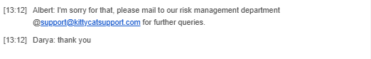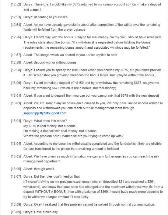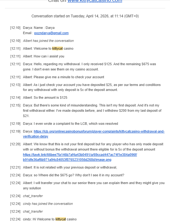 L'11 aprile ho effettuato un deposito di 25 dollari al Kittycat Casino senza utilizzare alcun bonus. Ho giocato esclusivamente alle slot per un po' di tempo e ho deciso di smettere quando il mio saldo ha raggiunto gli 800 dollari. Ho quindi richiesto un prelievo di 800 dollari. Dopo un po' di tempo, ho ricevuto un'email dal Kittycat Casino che mi chiedeva di completare la verifica. Ho inviato i documenti e il 12 aprile il mio prelievo è stato elaborato. Tuttavia, invece di 800 dollari, ho ricevuto solo 125 dollari.