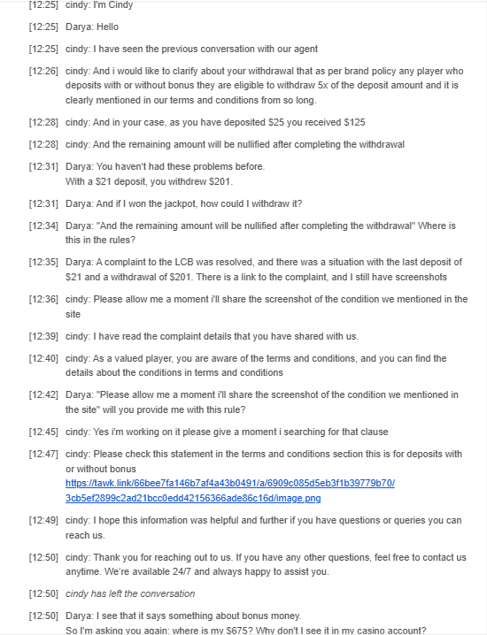 The rule limiting payouts for direct deposits is intentionally hidden in the bonus terms section, which misleads players and violates transparency. When I made deposits without a bonus, I didn't even check the bonus terms section (why bother if I'm playing without a bonus), and of course, there was no such information in the PAYOUTS section. I asked how they pay out jackpots in this case, but they didn't answer my question. I asked where my remaining $675 was—it's real money, not bonus money—and why don't I see it in my casino balance? I'd like to make a larger deposit, wager it, and try to withdraw the remainder, according to their rules. They replied that they withdrew my remaining funds, supposedly in accordance with their rules. When I asked them to provide me with this rule, they sent me this: "If a withdrawal is requested before fulfilling the bonus requirements, the remaining bonus amount and associated winnings may be forfeited." But as you can see, this rule applies to bonus money. And I played with my net deposit, without bonuses. And no one has ever provided me with another rule confirming their words (because it doesn't exist).
