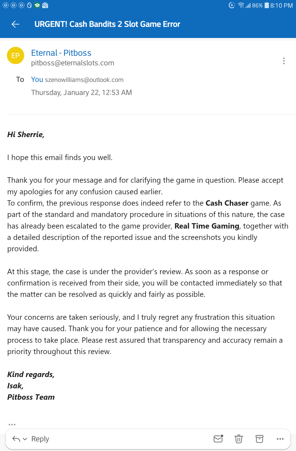 Il mio problema è che non ho ancora ricevuto alcuna risposta dal team di supporto del casinò in merito ai problemi tecnici osservati e registrati con due slot RTG sul sito Mr.O e a un altro problema tecnico separato ma simile sui siti dei casinò affiliati. Dopo diverse e-mail, l'ultima delle quali risale al 22 gennaio 2026, il casinò non ha ancora risposto a questa segnalazione di funzioni di gioco sospette. L'ultima comunicazione ricevuta dal Pit Boss è allegata al post. Accolgo con favore qualsiasi aiuto.