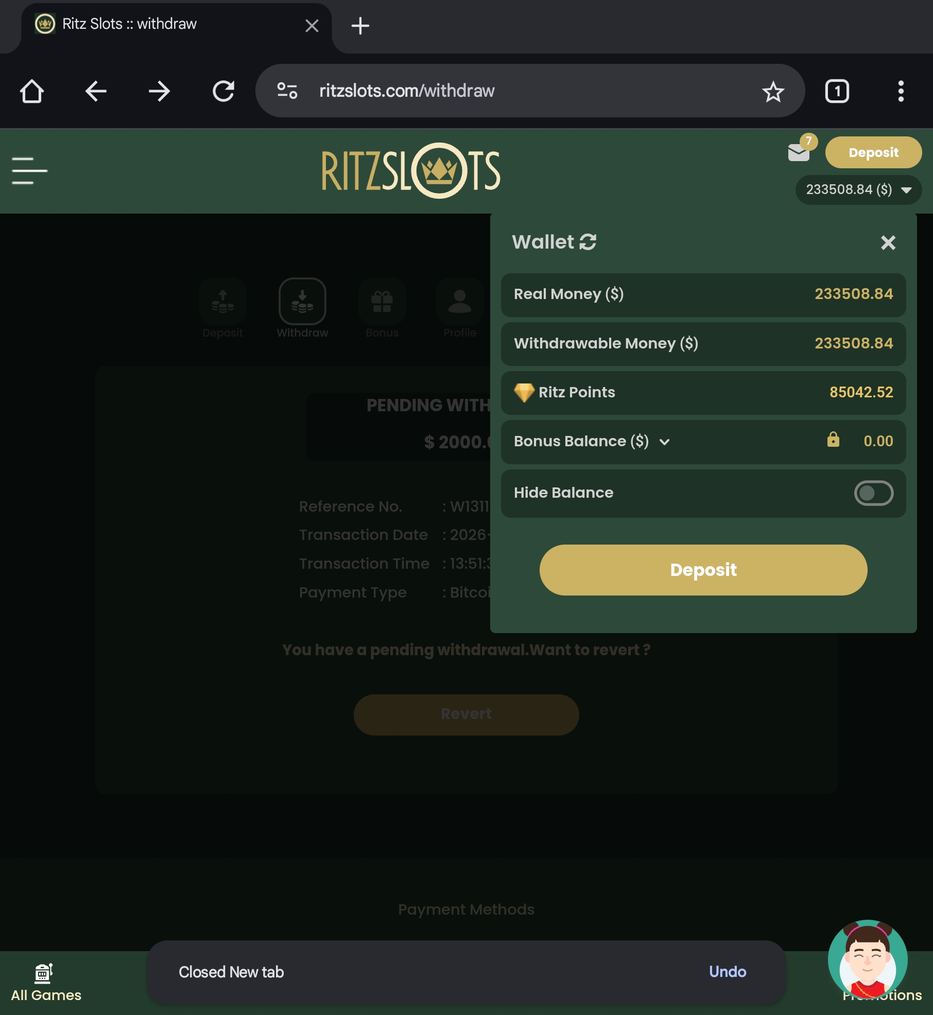 That said, we don’t want you to feel unfairly treated. To make things right, your most recent deposit of $ 50.00 is being made available to you as a refund. You may go ahead and request a withdrawal for this amount, and we’ll ensure it’s processed promptly and smoothly.
