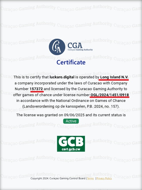 The document on their website shows Long Island N.V., company registration number 157372, and license number OGL/2024/1451/0918.
