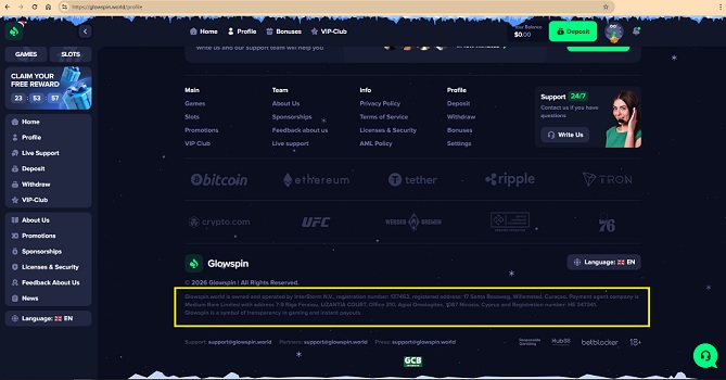 Sulla base dei registri ufficiali e delle informazioni presentate sul sito web, sussistono evidenti incongruenze riguardo alla proprietà aziendale. InterStorm (Curaçao) NV, indicata come proprietaria nel piè di pagina del sito web e nella pagina relativa a licenze e sicurezza, è stata ufficialmente sciolta il 10 novembre 2025 e pertanto non può legalmente possedere o gestire il casinò. Nel frattempo, i Termini e Condizioni del casinò identificano Long Island NV come proprietaria, nonostante la sua registrazione sia stata interrotta il 2 ottobre 2024.